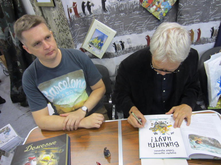 Андрей Аринушкин рисует автографы-иллюстрации, а Сергей Махотин задумчиво сочиняет очередное стихотворение: