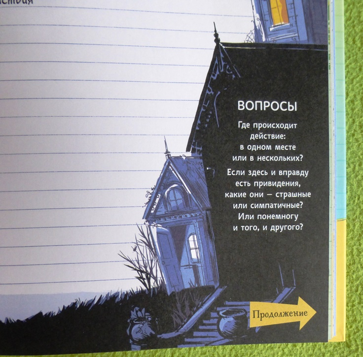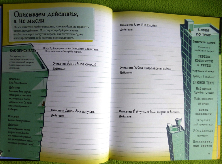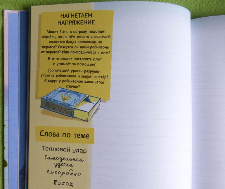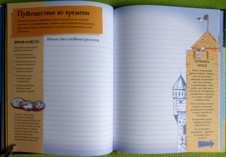 В этом творческом альбоме сразу совмещены теория и практика, на разворотах страниц можно сразу потренироваться и записать свои истории. Здесь есть «заготовки» сюжетов для истории с инопланетянами, путешествия во времени, ужастика с привидениями, триллера с участием акулы, шпионского детектива, леденящей кровь истории про заброшенную хижину в лесу и др.