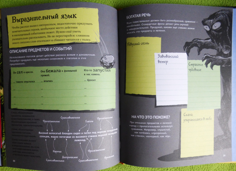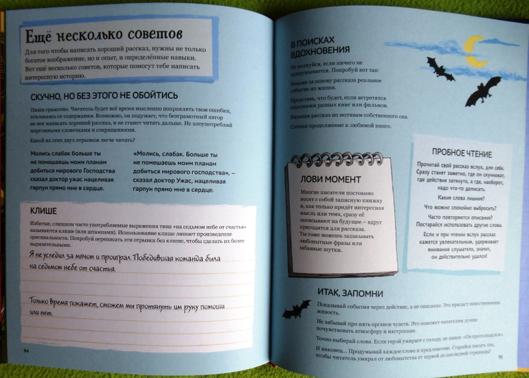 В конце книги «Набор юного писателя» -это копилка идей и хитростей, которыми пользуются профессиональные писатели. Советы из этого раздела научат детей составлять план рассказа и оттачивать свой стиль.