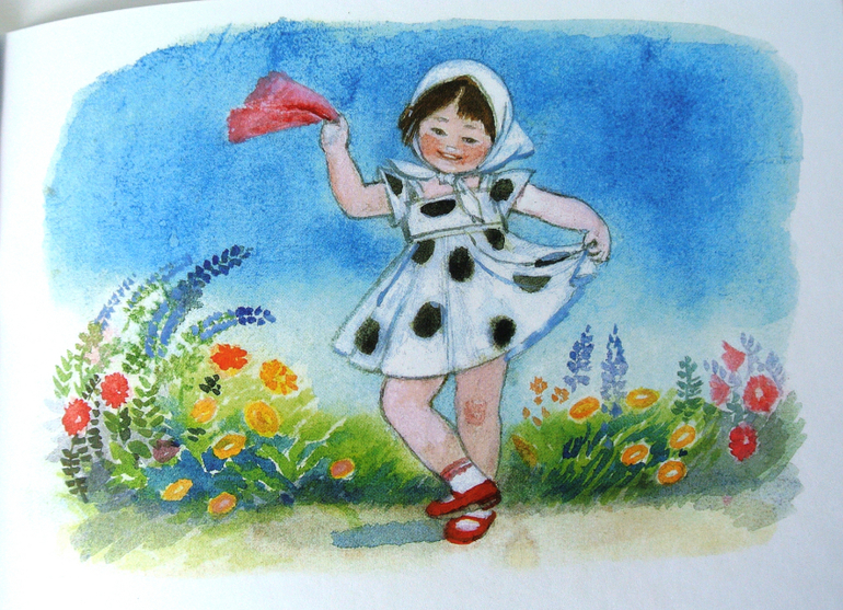 Посмотри, какая здесь девчушка. Нравится платье? Нет, это не зебра, это в горошек. Жук? Ну, пусть будет жук. Как у божьей коровки пятнышки, да?