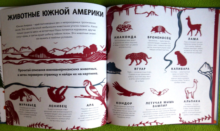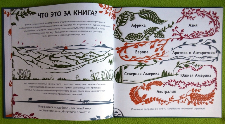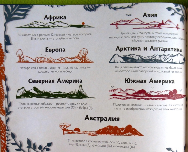Под обложкой книги скрывается много интересный фактов и заданий, здесь огромный простор для развития детской фантазии и воображения. Также можно потренировать счет, подсчитав количество каждого обитателя континентов.