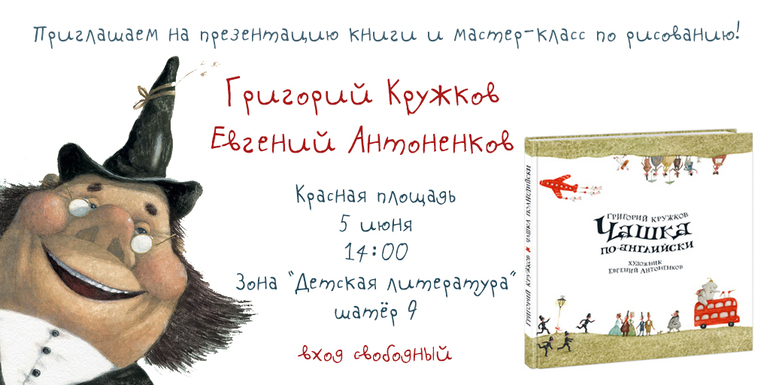 А в воскресенье, 5 июня, готовим для вас настоящий праздник. В зоне "Детская литература" состоится встреча с Григорием Кружковым и Евгением Антоненковым. Они представят свою книгу "Чашка по-английски". Вы сможете пообщаться и взять автографы. Для детей Евгений Антоненков проведет мастер-класс по рисованию. Начало мероприятия - 14:00.