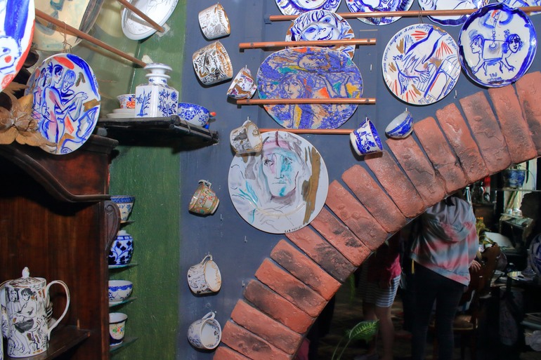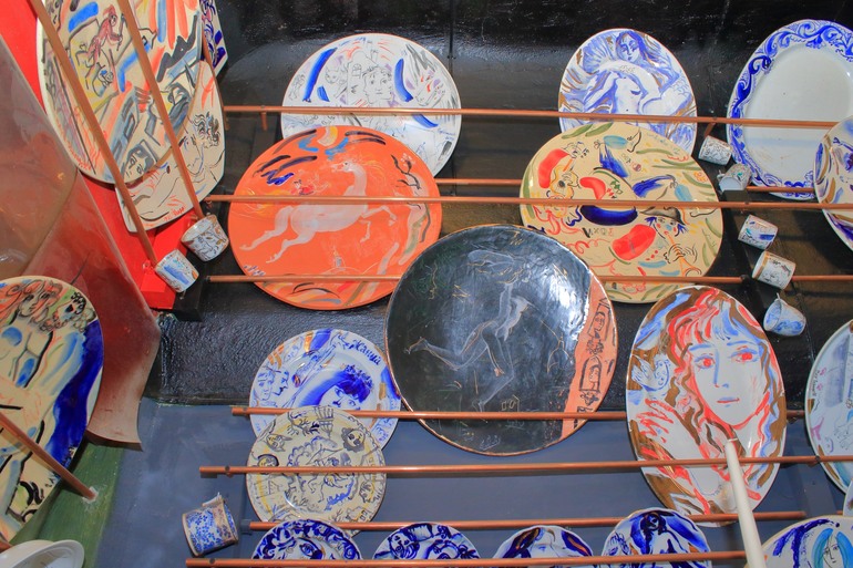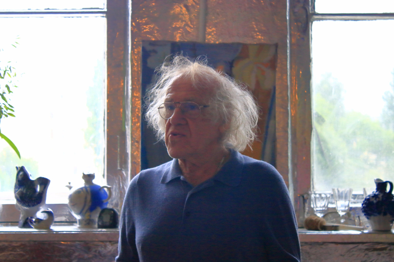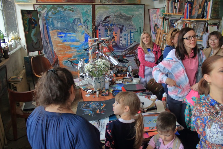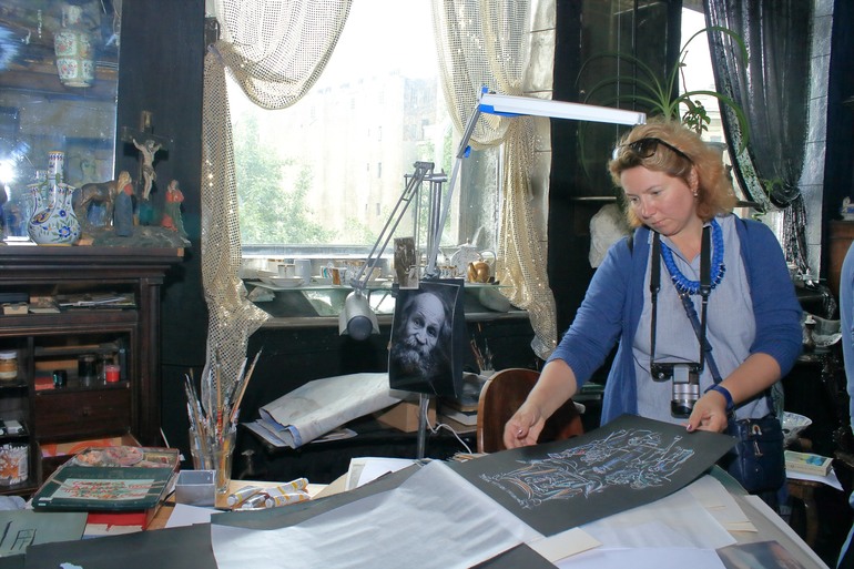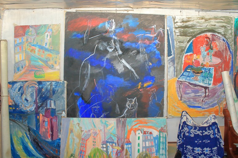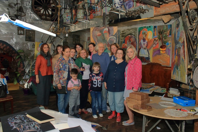 Трудно передать эмоции, которые захлестывают любого человека попадающего в это удивительное место. Глаза разбегаются, мысли путаются. Хочется все рассмотреть и запечатлеть в памяти. Но это трудно. Все воспоминая на грани видений. Было это или нет, видела или показалось, услышала или почудилось. Самым интересным на этой встречи было общение с хозяином. Он отвечал на вопросы, вспоминал разные случаи. Показывал работы, которые были везде. На всех горизонтальных и вертикальных поверхностях. И если на стенах они были развешаны, то на столах, столиках и диванах лежали огромными стопками. Все подоконники и столики живописно заставлены. Мне показалось, что это были натюрморты для работ. Может я ошибаюсь и эти вещи оказались там случайно. Но у такого Мастера даже случайно поставленный бокал с водой на окно становится какой-то сказочной инсталляцией.
