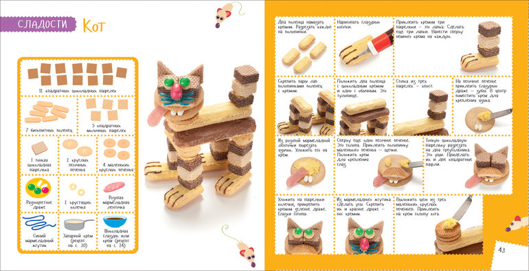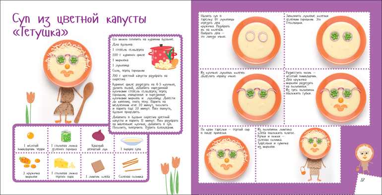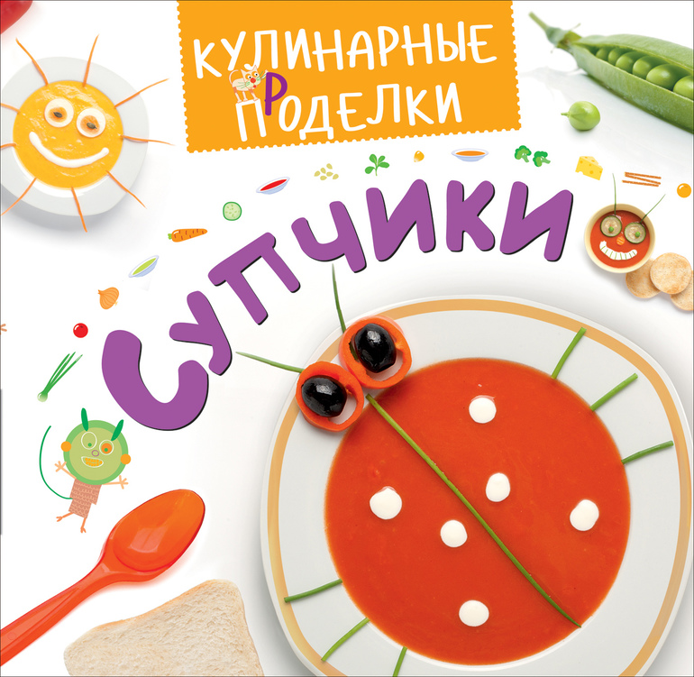 Вот вы могли бы съесть целого слона? А вот и можете, если это слон из жареного куриного окорочка, его уши из кружочков цукини, а бивни из маленьких морковок. Тот же окорочок легко превращается в лисицу, лобстера или уточку. Очень часто бывает, что малыш отказывается есть суп. А если это не совсем суп? А… божья коровка (она же томатный супчик)! Или картофельный суп-пюре «строгая няня»! Фантазию составителей этих хулиганских рецептов было уже не унять, поэтому в компанию к первым и вторым блюдам добавились забавные «Десерты» и «Веселые перекусы». В итоге вафли превратились в конструктор получше лего (потому что его можно съесть), а на книжке с вариантами для легкого перекуса просто отдыхала душа. Тут и бутерброд-морж, и попугай из морковки, и «хот-кот» (ведь хотдог совсем не похож на собаку, а хот-кот на кота - вполне).