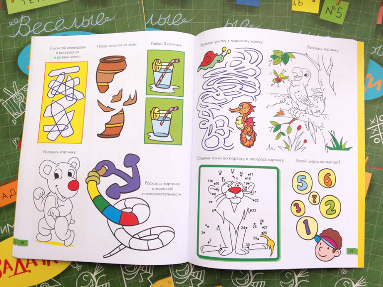 Вот примеры заданий: увеличить картинку по клеточкам и раскрасить ее, найти недостающий фрагмент картинки, разгадать кроссворд, соединить точки по порядку и получить рисунок, провести героя по лабиринту, пронумеровать картинки, чтобы получился связный рассказ, найти правильную тень, сосчитать предметы, найти спрятанные цифры, найти 10 отличий и многое, многое другое.