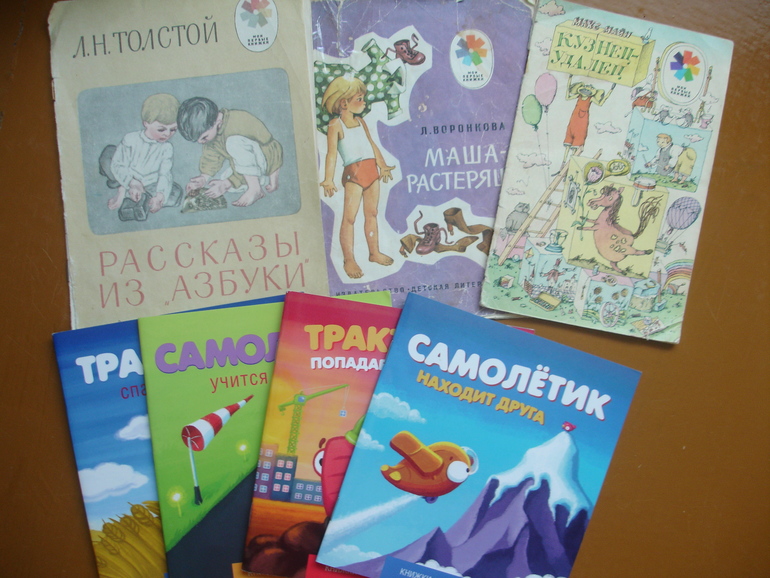 Книжки-мальчишки. Купила эту серию, едва узнав, что у меня будет мальчик. «Ну надо же что-то мальчишечье!» Тогда я и не подозревала, что эти книги потом будет не достать. У меня 9 из 12 представленных в «Лабиринте». Есть ещё про Катерок и Паровозик. Про Тракторок и Самолётик достала как самые понятные. С рекомендованным возрастом какая-то путаница. На одной книге «для чтения взрослыми детям», на другой «для старшего дошкольного и школьного возраста» (ну, тут они хватили лишку. Истории очень простые). Тракторок любим больше. Про стройку читаем очень часто, хотя вся техника Сане и так знакома.. Теперь всегда, когда видит каток, комментирует, что у него бочка вместо колёс. Чтение про урожай чуть не сорвал после слова «жижа». Угораздило же Тракторку провалиться в болото. Теперь любая жидкость, начиная с супа, у нас - жижа. Отсюда же в словарь забралось полезное слово «цистерна», и лишний раз закрепилось понимание, что машинам нужно топливо, бензин. Из книги про Самолётик узнали про парашюты и парашютистов. Но Самолётик явно проигрывает Тракторку. Вообще, я ждала большего интереса. Но жизнь показывает, что Санину страсть к легковым и машинам не вытеснить ничем. Саня покажет брызговики и подфарники, он различает марки вплоть до каких-нибудь "ссанг йонгов" и "датсунов", узнает "дэу" по фарам, а "бмв" по решётке. А трактор - ну, трактор.