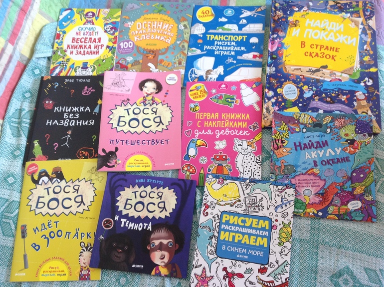 А я заказала Тосю-Босю на пробу. Все тут хвалят. На фото еще книжки не хватает про сбежавшие уши. Пока восторга не увидела :-))) но мы скорее от количества книг были в шоке и растерянности. Но клевика уже раскрашивать начали.