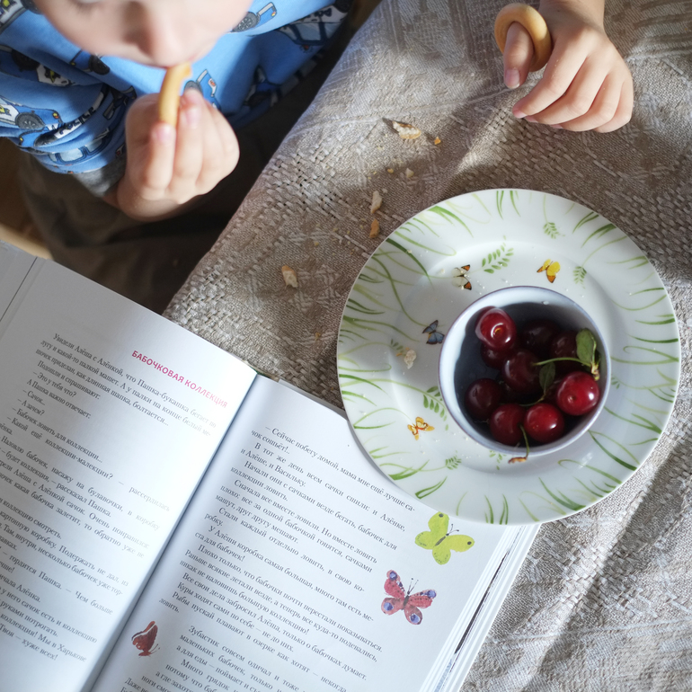 Читаем мы с Вовой сегодня за полдником. У Вовы сушки и печенье, у меня вишни. Такая вот почти трагедия - не ест ребенок полезные ягоды.