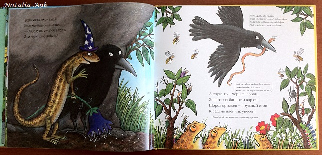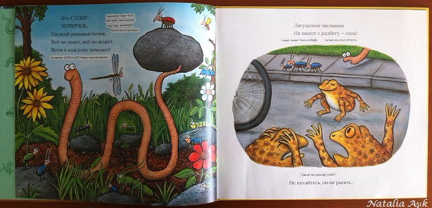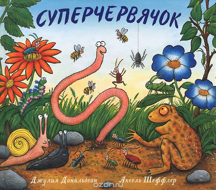 Еще одна книга от замечательного трио Дональдсон-Шеффлер-Бородицкая. История о "суперловком, супербыстром" червячке, который помогал своим друзьям-насекомым, букашкам, лягушкам. О супер-способностях червячка узнает злая колдунья-ящерица, и приказывает своему слуге-ворону похитить нашего героя. Червячок заколдован и вынужден искать клад для колдуньи, а его друзья-насекомые, жучки, паучки и прочая мелкая живность придумывают хитрый план, как спасти из плена супергероя. В итоге колдунья наказана, червячок спасен, и все рады и счастливы :) Почему-то мамы девочек не очень жалуют эту книгу, может, из-за личной неприязни к мелким насекомым, а по мне так замечательная история, о дружбе, взаимовыручке, а заодно можно познакомиться поближе с миром ползающих и летающих. И, кстати, нарисованы все эти букашки-паучки очень даже симпатично :)
