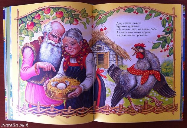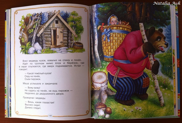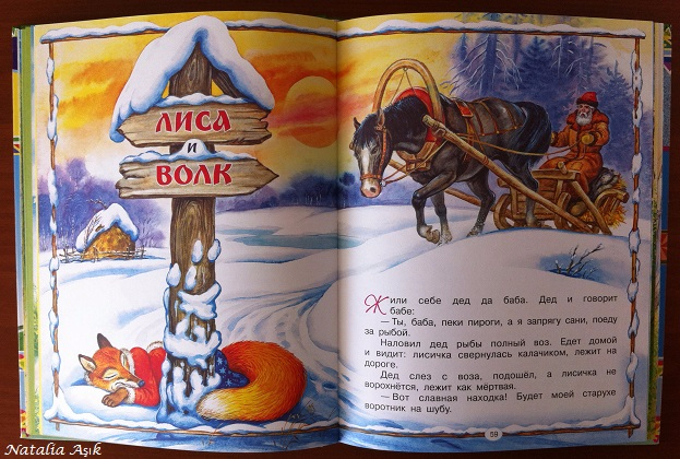 Хороший сборник сказок для самых маленьких, классические "Колобок", "Теремок", "Репка", "Золотое яичко", "Лиса и волк", "Кот и лиса", "Волк и козлята", "Петушок - золотой гребешок", "Маша и медведь", "Три медведя" и "Бобовое зернышко". Сказки чередуются с потешками и песенками-колыбельными. Иллюстрации крупные, детальные, на каждой странице, быть может, кому-то не понравится такой стиль изображения животных, разодетых-наряженных, а по мне так пускай, лисе-красе очень идет такой образ нарядной барышни, то платье, то полушубочек, волк тоже в кафтане очень хорош, в целом образы вполне гармоничны. Дочке иллюстрации нравятся :)
