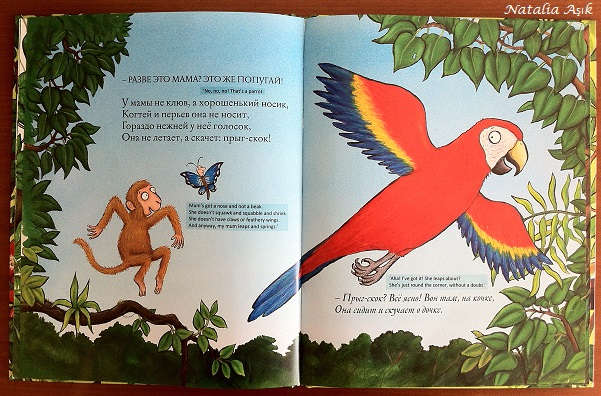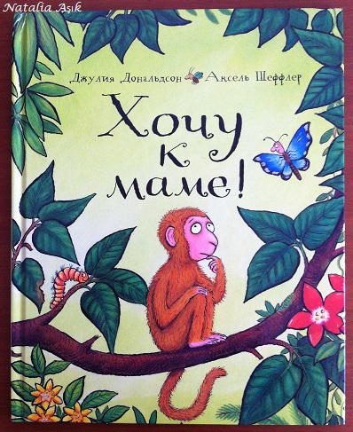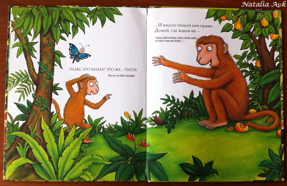 Уже ставшей классика от Джулии Дональдсон, с замечательными иллюстрациями Акселя Шеффлер и великолепным переводом Марины Бородицкой. История о маленькой обезьянке и мотыльке, который помогает искать потерявшуюся маму по словесным описаниям обезьянки. Книга замечательная, по ходу поиска маленький читатель не только переживает трогательную историю расставания и вновь обретения обезьянкой своей мамы, но и знакомится с животными джунглей - слоном, змеей, пауком, попугаем, лягушкой, летучей мышью, узнает их отличительные особенности, знакомится с понятиями большой-маленький, похожий-непохожий, теплый-холодный. А еще это одна из немногих книг, где есть не только малыш и его мама, но и папа :)