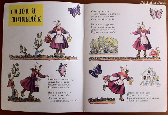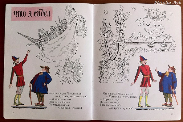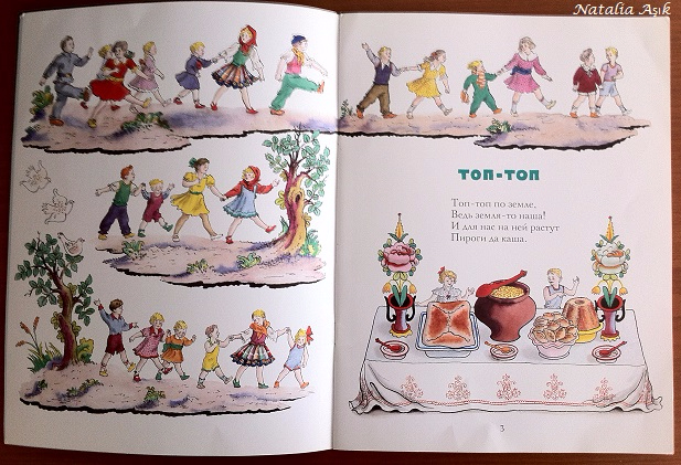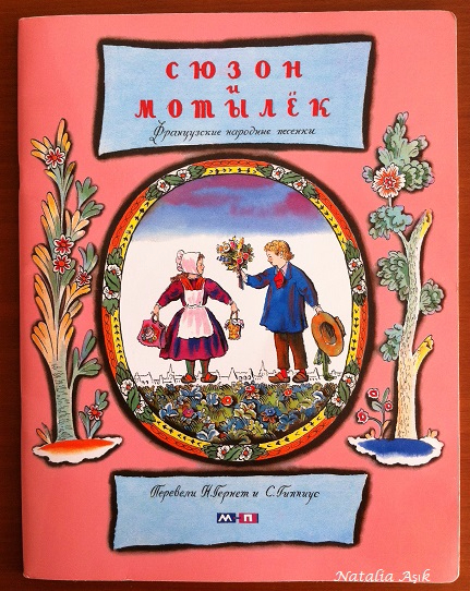 Еще одна тонкая книжка, тоже от Мелик-Пашаева, в нашей библиотеке уже давно, но интерес стала вызывать где-то после 1,7 лет, ближе к двум стала особенно любима дочкой, рассматривается и перечитывается бесконечно. Замечательные иллюстрации Конашевича, очень детальные, качественная печать, мелованная бумага, французские песенки и стихи, звучные, легкие, с юмором и неподражаемым шармом, я бы сказала, такая совершенно девчачья книжечка :) Точно такая же была у меня в детстве, может, поэтому эти милые песенки мне так близки и понятны. Стихи очень легкие, после пары прочтения запоминаются наизусть, можно рассказывать, даже не глядя в книгу.