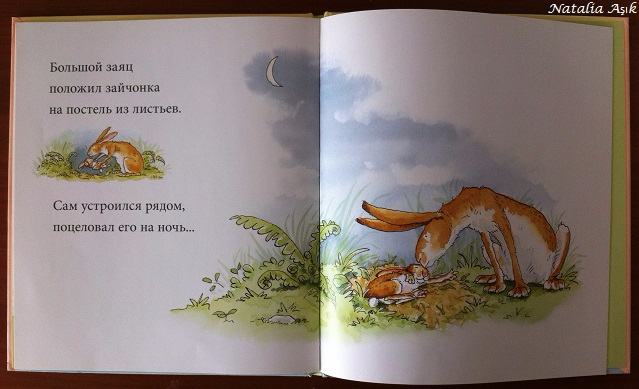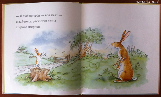 Милая история о маленьком зайчонке и большом зайце, сюжет о самом главном - о любви родителей и детей, о том, как ее можно измерить. Особенно трогательная концовка, вот так вроде просто, но так емко можно выразить свои чувства: "И я тебя люблю... до самой луны.. и обратно". У меня всегда наворачиваются слезы, когда я читаю эти строки, и комок в горле. Прекрасные, очень нежные акварельные иллюстрации. Читала отзывы, что книгу можно рекомендовать от 1,5+ и даже раньше, но у моей дочки интерес появился совсем недавно, хотя она нежно любит зайчиков и все, что с ними связано. Мои периодические попытки почитать-посмотреть отвергались, но однажды дочь сама нашла книгу на своей полочке, начала листать, рассматривать, а потом я предложила почитать-посмотреть вместе, и теперь книга одна из любимых :) часто листает сама и "рассказывает" про зайцев :)