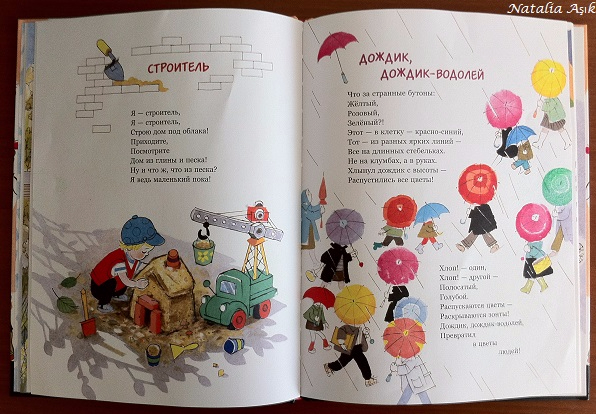 И да, про иллюстрации к стихотворению "Дождик, дождик-водолей", правильно пишут замечания, что очень не хватает зеленого зонтика на картинке. По тексту так и просится показывать по очереди разноцветные зонты "Что за странные бутоны - Желтый, Розовый, Зеленый?!". Пришлось перекрасить один из зонтов :))) Еще руки чешутся добавить "в клетку красно-синий" и один "из ярких разных линий", чтобы уж до полноты картины :) но пока читаем так.