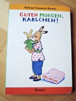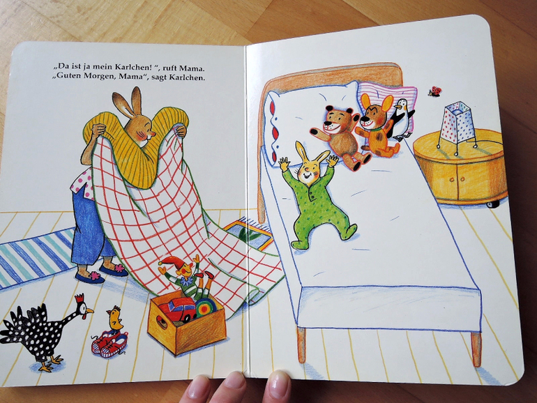 Карлхена я сначала не думала покупать, так как мне не очень нравятся иллюстрации. Но сами истории очень трогательные, поэтому я взяла про то, как папа укладывает кролика Карлхена каждый вечер спать, с разными уловками, потому как Карлхен как многие малыши совсем не хочет идти в постель. И про маму, которая каждое утро будит Карлхена.