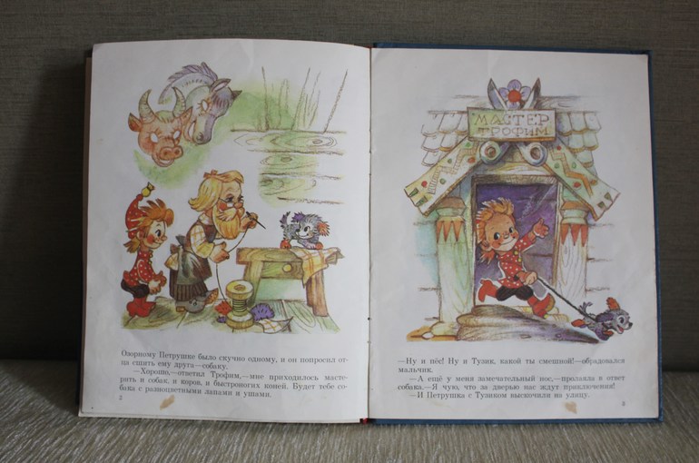 В библиотеке летом брали "Приключения Петрушки" (полную версию), Диме читала бабушка, я только изредка отдельные главы. Мне не нравилось, Диме - да. У нас есть лайт-версия с текстом-подписями к картинкам. Вот картинки эти люблю, для меня Владимирский - это именно Петрушка, а не Буратино.