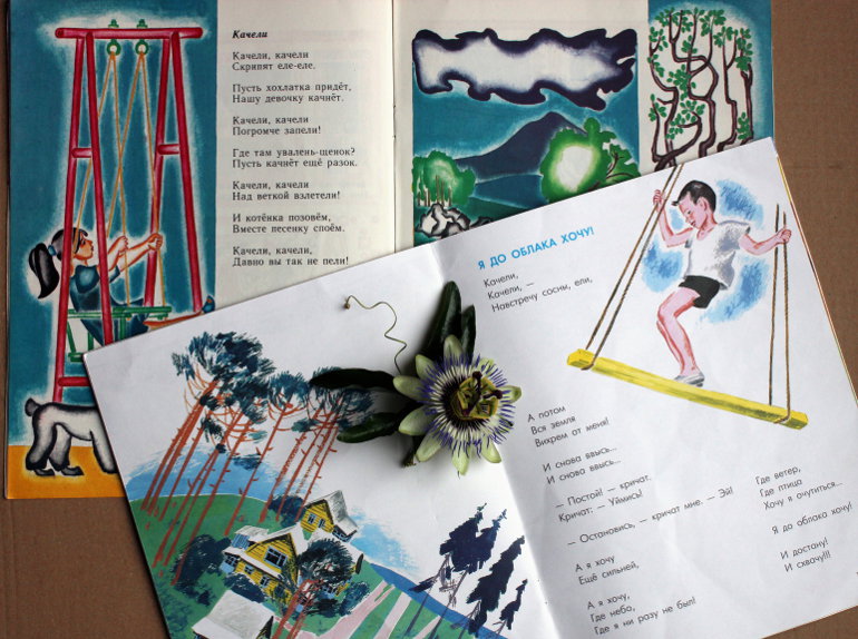 Моей дочке книжка сразу приглянулась, особенно на фоне любви к книге Эммы Мошковской "Дождик вышел погулять", ведь там тоже "качели, качели"!