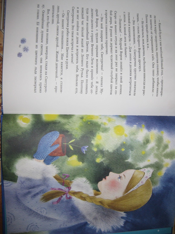 В книге 6 достаточно больших глав, читали по 1-2 в день, и после каждой Аня переживала за Снегурочку, как же она справится, и что же будет дальше, а еще какой же все-таки подарок для нее приготовил ворон, об этом мы узнаем в самом конце книги.