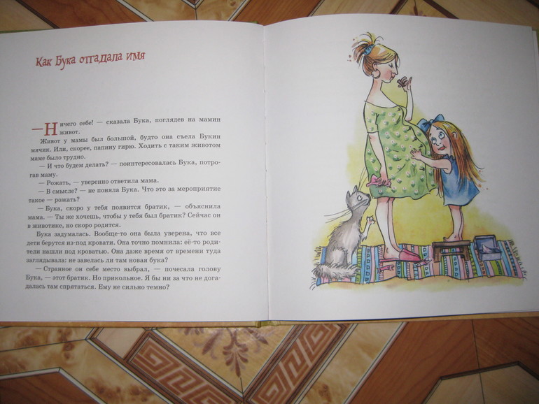 В первой главе "Как Бука отгадала имя" - описывается как мама еще беременна, ну и все вытекающие отсюда вопросы - как малыш там ест, как он оттуда выберется, о том что мама уедет в роддом, о необходимости выбрать имя. Написано с юмором и по -детски.