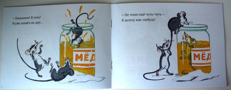 А вообще книжка приобретена для третьей мышки (мед любит ПОКА исключительно на картинках). Уверена, что понравятся и крупные иллюстрации, и стихи (повествование идет от имени мышей). Небольшие фразы в рифме легко запоминаются и вызывают улыбку:).