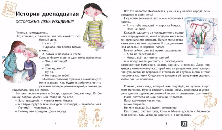 Вообще Женя точно такая же, как все другие семилетние девочки. Она терпеть не может, когда её разглядывают или считают какой-то особенной. Она умеет чистить картошку так, чтобы шкурка превращалась в тонкие длинные ленточки. Умеет пришивать пуговицы - почти так же красиво, как папа. А ещё у неё отлично получается рассказывать разные истории - потому что с ней всё время случается что-нибудь интересное...