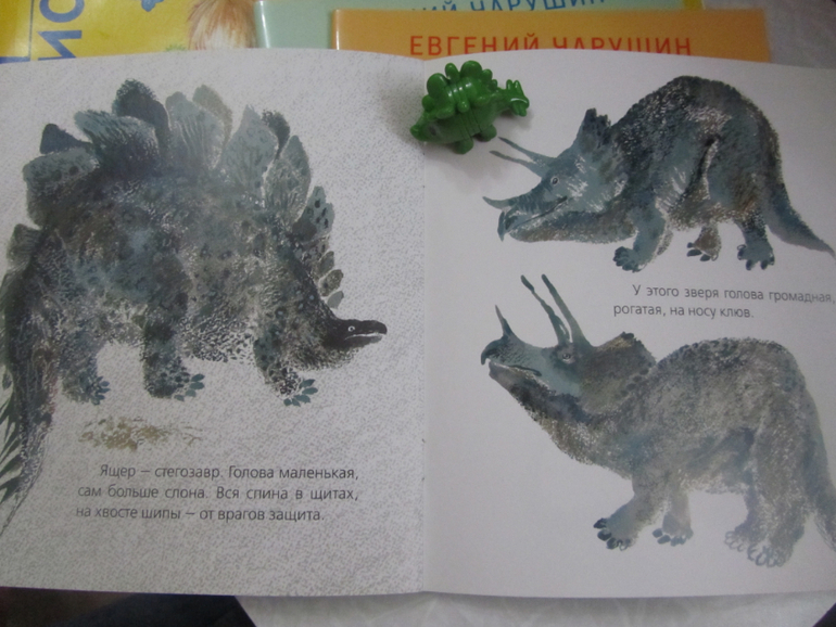 Вот насколько дочка была равнодушна к динозаврам, так сыночек начал постепенно ими интересоваться. А у нас дома и нет ничего про них, хорошо когда-то купила эту тоненькую вместе с другими тоненькими чарушинскими книжечками.Очень реалистично изображены животные и главное язык повествования очень простой и в тоже время акценты проставлены на самом главном, как раз для двухлеток вполне подходит. Вообще мне кажется надо обладать большим талантом, чтобы вот так в пару строчек донести до детей главные слова пр то или иное животное, Чарушины в этом отношении большие молодцы. Книжка сыночку приглянулась, частенько её достаёт, в отличие от других из этой серии - читаем только по моей инициативе ((