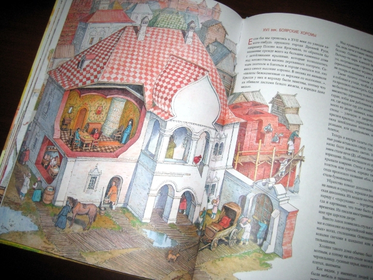Повествование выстроено по хронологическому принципу и охватывает период строительства на Руси разного рода сооружений начиная с VIII и заканчивая XVII веком. Иллюстрации прекрасно вписываются в текст и идеально гармонируют с содержанием, его поддерживая: здесь не просто картинки, здесь полноценные схемы, строения в разрезе со всеми необходимыми пояснениями: