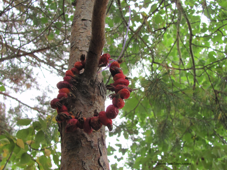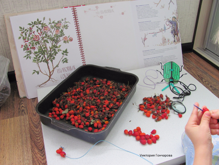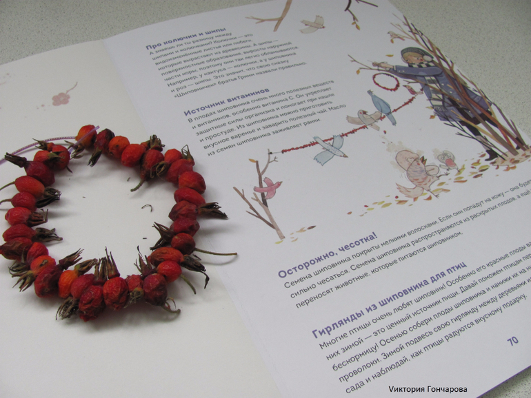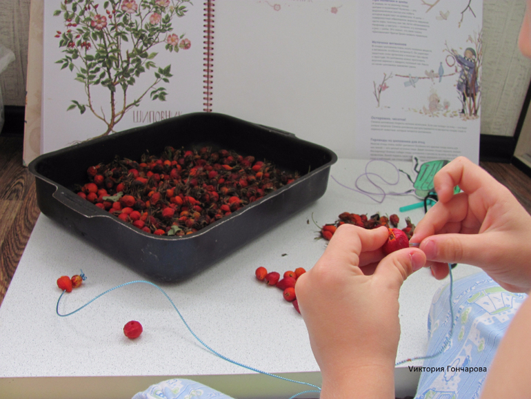 Воплотили классную идею из книги - сделать гирлянду из плодов шиповника для пернатых.