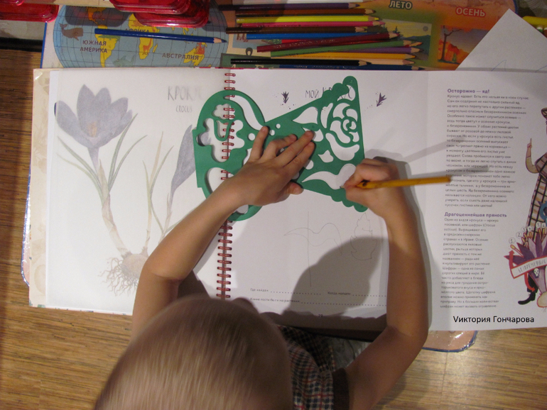 Конечно сам лист в большинстве оформляла я, но ребенок клеил наклейки,а позже сам принялся оформлять другой лист книги - лист с крокусом.