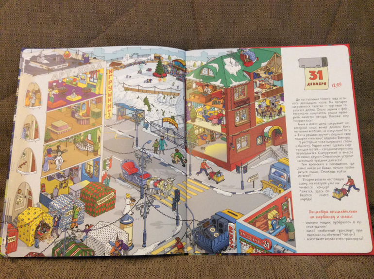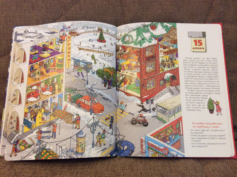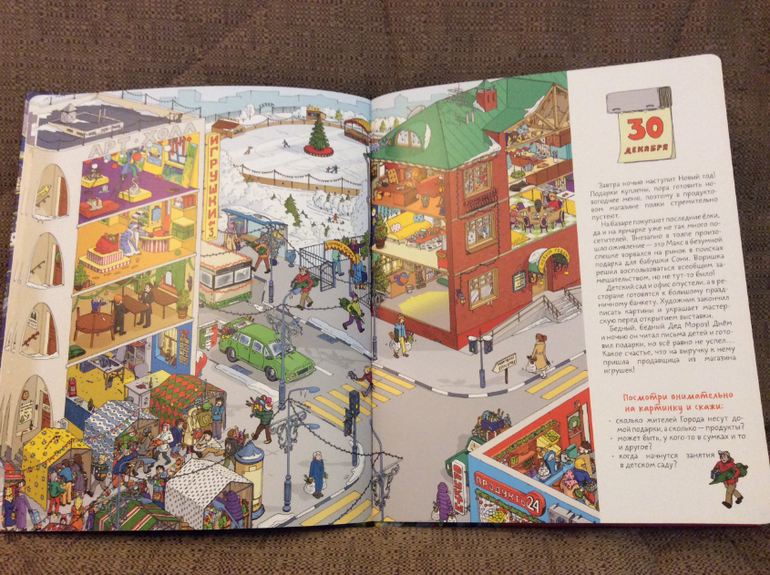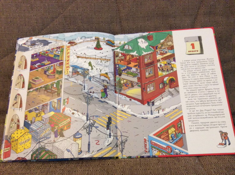 В книге 10 разворотов. На каждом развороте показана одна и таже улица, но дни меняются и видна вся предновогодняя суета.