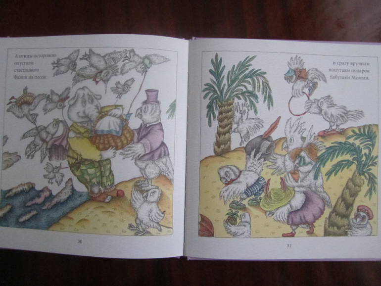 Здесь рассказывается про слонёнка, который вместе со своими питомцами-птичками решил полететь в гости к попугаям в жаркие страны. Но по дороге самолёт сломался и упал в воду, однако птички спасли слонёнка, и они благополучно добрались до попугаев ))