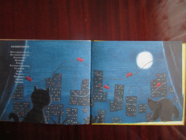 Вот на этом развороте, когда я читаю, что наступила ночь и все собаки спят, сын всегда показывает на одну не спящую собачку и кто его знает, почему она не спит - какой полёт для фантазии )))