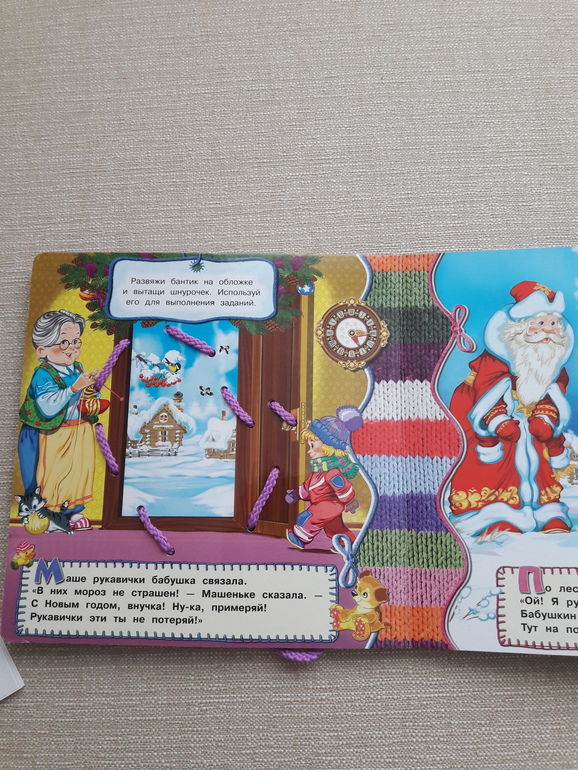в "новогодней истории" есть шнурок, и на каждом развороте задание с ним - завязать мешок или пояс деду морозу и др. А какой колоритный дед мороз - наш НАСТОЯЩИЙ))))
