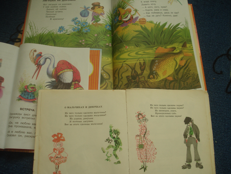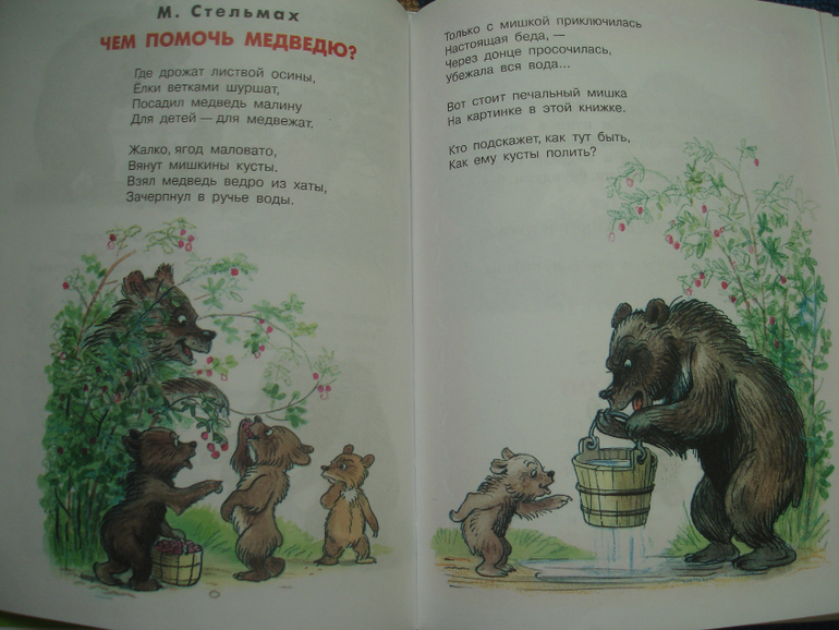 Добавили «Ребятам о зверятах». Задумка интересная - несколько разделов про лесных животных, про тех, которых приручил человек, сначала идёт краткая справочная информация, затем сказки «в тему». И подборка произведений мне понравилась. Мы читали не всё, прочитали сказки Пляцковского (понравились), кое-какие стихи, с интересом познакомились со сказками Кипниса - «Зайка-траву поедайка» и «Петушок в жёлтых штанишках и Курочка в рябеньком платьице». «Зайка-траву поедайка» Саньке прямо очень понравилась. Ещё Саньке очень понравилась «Капризная кошка» (уже как-то читали) и не самое известное, но складное и приятное стихотворение Маршака «Курочка ряба и десять утят». Собственно, за содержание и держу эту книгу. В самовывозе быстро проглядела, что углы в порядке и страницы не перевёрнуты, равнодушно отнеслась к не самым плотным страницам, а вот на особенности иллюстраций не обратила внимания. Сутеев где-то бледен, где-то - не очень, ещё терпимо.