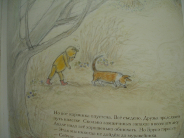А вот Бруно топает назад. Читаем по тексту: «Но вот корзинка опустела. Всё съедено. Друзья продолжили путь налегке».