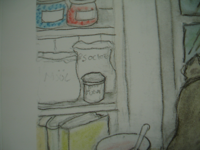 Я знаю немецкий, так что несложно было догадаться, что слово, начинающееся на 'm' и заканчивающееся на 'l', очевидно, - «мука». Краткий урок шведского: «мука» по-шведски будет 'mjöl'. Второе слово, кажется, на 's',не опознала, но видно, что это не просто каракули, и для знающих язык оно должно быть читаемо.