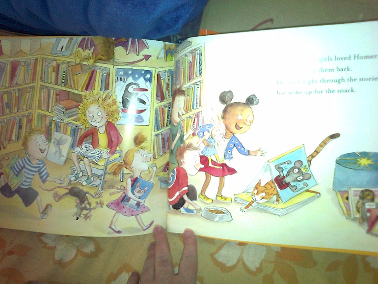 Первой к нам пришла книга про библиотечного кота. Милый рассказ про домашнего кота Хомера, который пустился в путешествие по городу и пока не дошел до места работы своей хозяйки-библиотекаря. Вот несколько разворотов.
