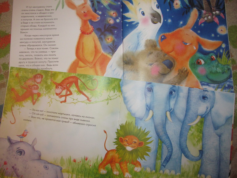 А еще у львенка, который очень хотел быть похожим на папу, ведь у папы такая красивая грива, и за это его все уважают. Но оказалось, грива не важна, если у тебя доброе сердце (Н. Чуб Кенгуренок Бамси, Я храбрый, как папа).