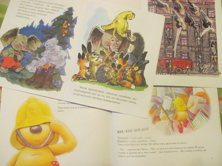 в пожарных, спасателей (Г. Цыферов Жил на свете слоненок, С. Маршак Пожар, Р. Тайгер Тяпа-растяпа)