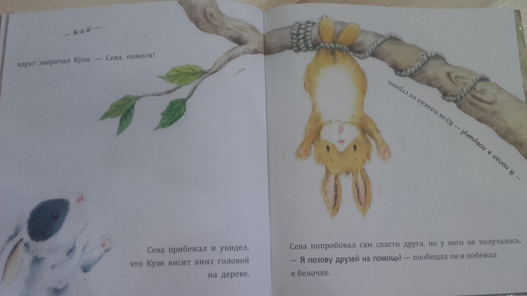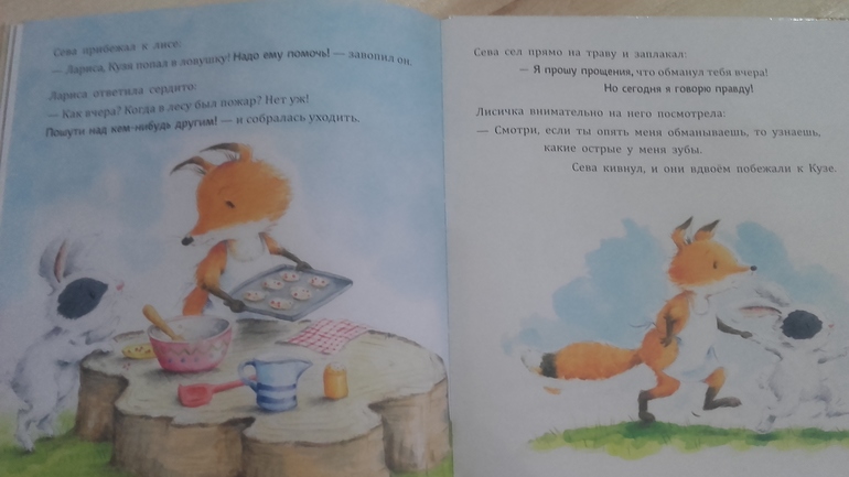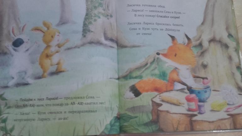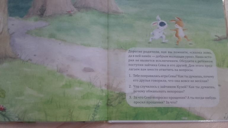 Книга большого формата, хорошая бумага. Приятные детские иллюстрации. Простая, но поучительная история о том как сначала зайчик с другом всех разыграли, а когда им действительно стала нужна помощь никто им не поверил. Книга отлично подойдет уже с двух лет и цена приятная. В конце есть вопросы по книге для ребенка. Мы книгу купили в подарок другу Севе, он ей очень обрадовался, хоть уже и не по возрасту, но когда у главного героя такое же имя это обрадует ребенка))) С сыном тоже ее прочли, с удовольствием прослушал, но расстался с книгой легко. Не жалуем мы зайцев))) В серии три книги