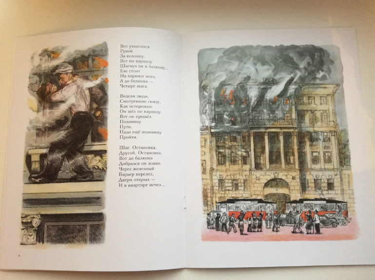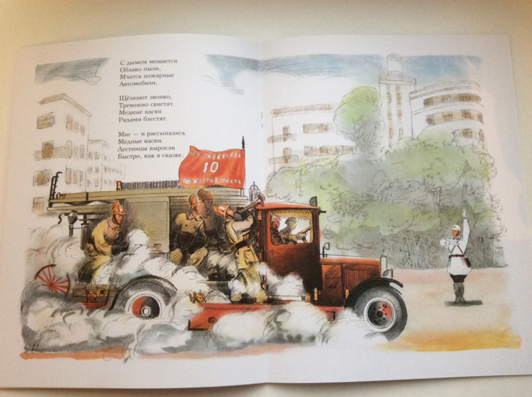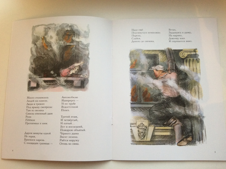 Это уже советская книга с патриотическим советским текстом. История о том, как какой-то парень, проездая мимо дома и увидя пожар, побежал в горящий дом и спас девочку. А потом, как ни в чем не бывало, поехал дальше по своим делам. Герой, да и только)