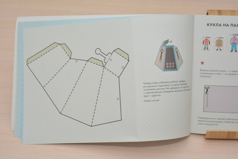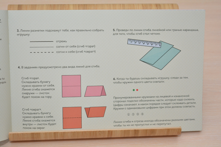 На каждой странице есть инструкция по изготовлению конкретной игрушки, та часть страницы, где находятся детали для изготовления, имеет перфорацию, т.е. ребёнок всё легко, просто и самостоятельно может оторвать.