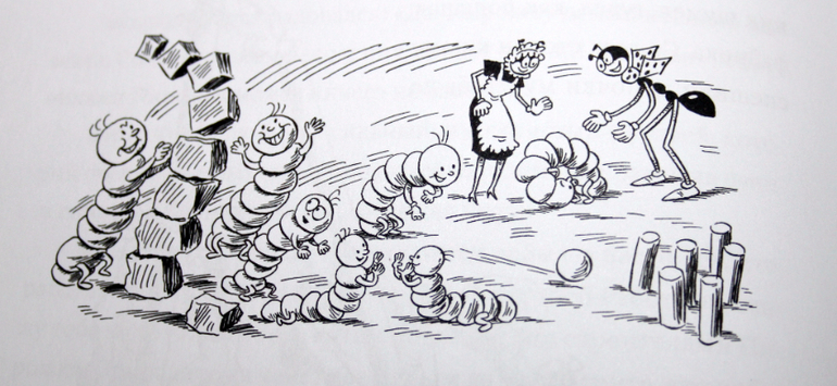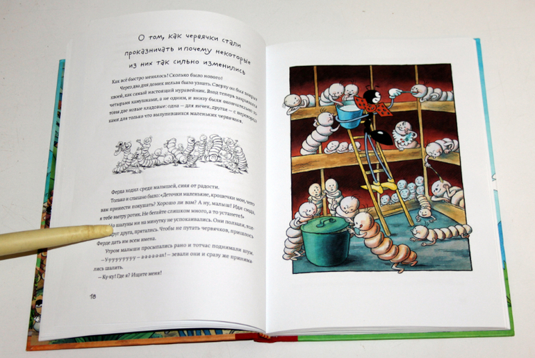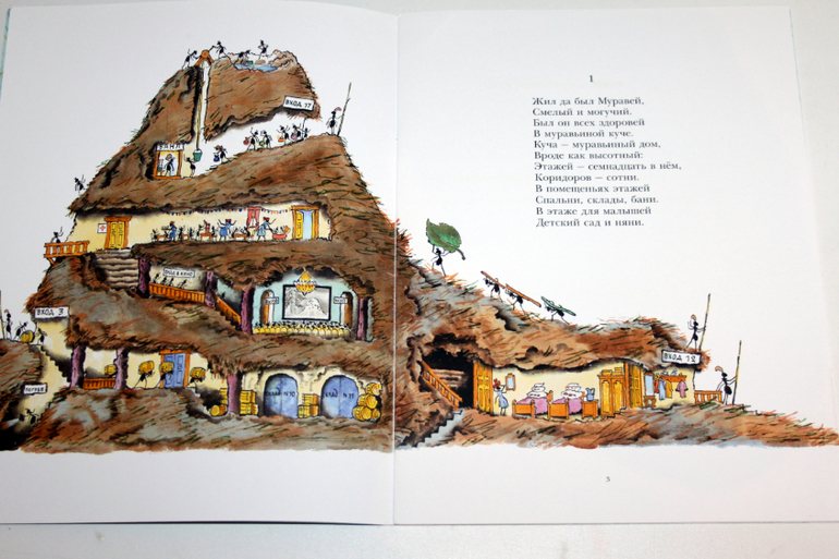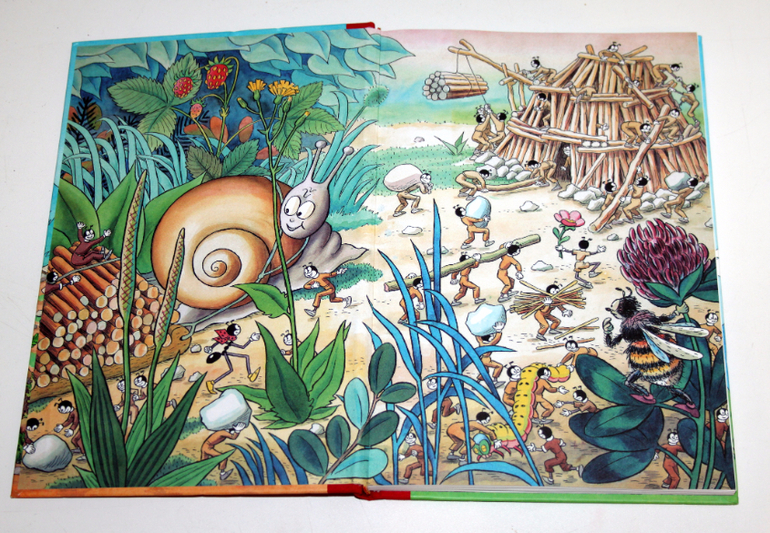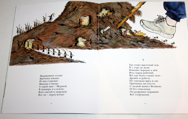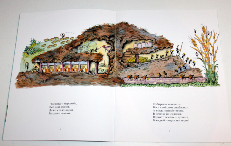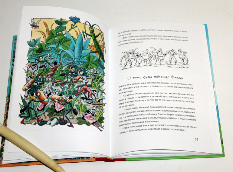 А тут показана вся жизнь в муравейнике, кто что делают, как смелый муравей управляется со своими делами, защищает муравейник. И вот приходит мальчик, который хочет разворотить муравейник палкой. Знакомо, да?. У меня Никита постоянно пытался палкой муравейник разворошить и муравьёв давить пытался, когда маленький был. Покупала эту книгу специально, чтобы показать ему, что муравьи тоже живые и что они столько труда вкладывают в строительство дома и труд надо уважать.