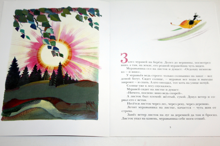 Прекрасная история про то, как муравьишку на листе унесло далеко-далеко от родного дома и ему надо было вернуться до захода солнца, но он никак не успевал. И о том, как другие жучки-червячки ему помогли.
