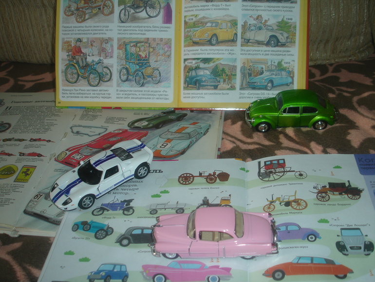 Не знаю, заметно ли, как помята «Куда торопятся машины?» Залистал уже её, каждый день берёт. Все истории транспорта пролистывает ради раздела с историей автомобилестроения. Заставляет читать слово в слово, что там написано, хотя для него это всё абракадабра. Но ничего не спрашивает, просто внимает. Хотя что ему говорит тот факт, что Гитлер велел начать разработку Фольксвагена в 1934 году, вот та модель «Мини» сочетала в себе особенности для езды по городу с турбокомпрессором для открытых дорог, а Форд GT40 выигрывал гонки в Ле Мюне (вообще-то в Ле Мане, но в одной энциклопедии переведено именно так) четыре раза с 1966 по 1969 год. Я теперь вся напичкана этими датами, несмотря на мою плохую память на них, и могу точно сказать, сколько лет производили «Жука», а сколько - «Ситроен 2 лошади». Зато Санька радуется, что у него есть похожий Форд GT, а ещё «Жук» и розовый «Кадиллак» (да, как у мамы Элвиса Пресли).