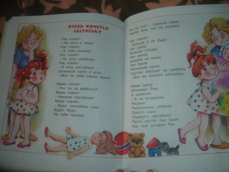 Сборник Ю.Кушака достала я, в надежде почитать как раз его зимне-новогодние стихи, но у Сани были свои планы, так что как раз всех этих танцующих ёлок он проигнорировал. Читали просто стихи. Саня, увидев меня с фотоаппаратом, особо велел сфотографировать этот стих. Сестрёнку ему вообще-то не хочется, но стих почему-то нравится.