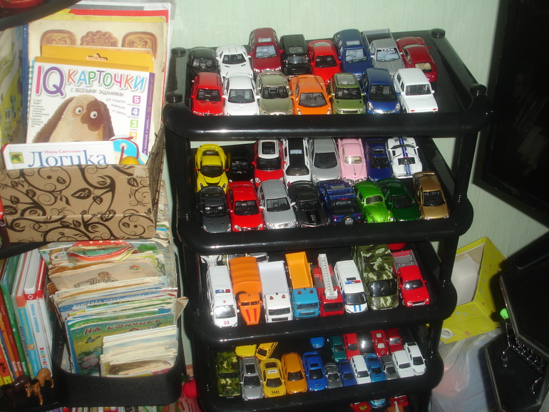 Оценили толщину вырезок? На коробку из-под балеток хватает. Сколько же журналов попало под ножницы ради этой коробки... Здесь все Санькины бумажные машины. Естественно, он знает все модели, от бюджетных китайских и корейских, до элитных европейских, а ещё русские, американские...Каждый день, начиная с лета, он их перекладывает, рассыпает, топчет (вон уже коробку повредил). Уже грозились выбросить, если не будет собирать. Ему уже самому лень собирать всё это, когда оно рассеяно тонким слоем по залу, попадает под ковёр. Вздыхает, собирает вместе со мной. Пробовали прятать - расстраивается, чуть не плачет, боится, как бы правда не выкинули. Ну, и коллекция. На Новый год появится ещё бензоколонка, да и за новогодние праздники автопарк ещё слегка расширится.