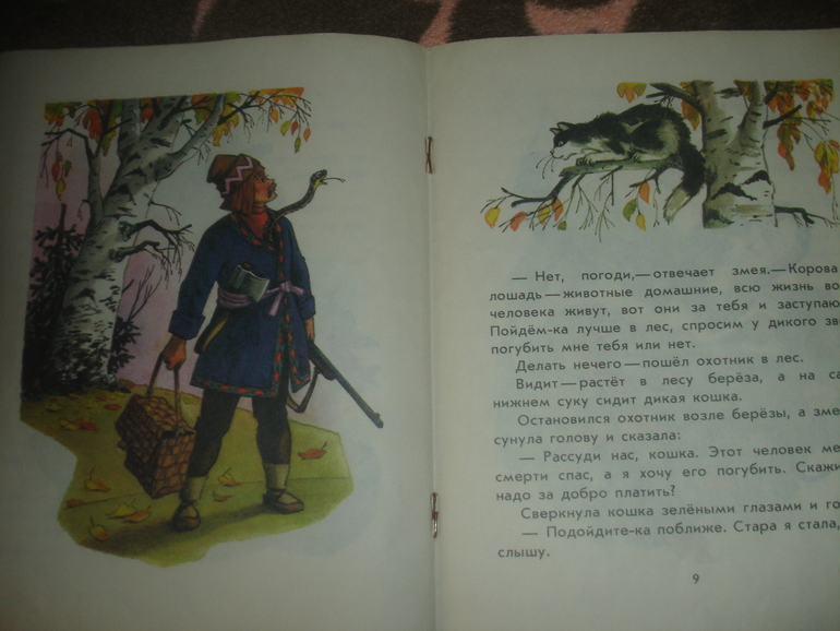 "Охотник и змея"- показывала эту книгу среди другой букинистики, вчиталась и поняла, что можно попробовать читать. Сказка «Охотник и змея» содержит довольно часто встречающуюся идею, чем платить за добро: добром или злом? Охотник спасает змею, а та собирается его ужалить. Охотник предлагает спросить у встречных, чем надо отвечать на добро, а уж если они скажут, что злом, то пусть змея его погубит. Корова и лошадь говорят, что платят своим хозяевам добром за то, что те за ними ухаживают, но змея недовольна и решает спросить у дикого, а не домашнего животного. Так охотник и змея спрашивают кошку, тогда ещё дикую. Кошка убивает змею, а охотник в благодарность забирает кошку к себе домой и обещает всячески холить и лелеять её. С тех пор люди и кошки живут в мире и дружбе.