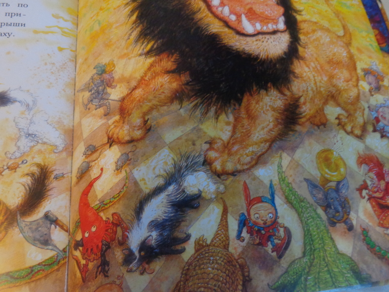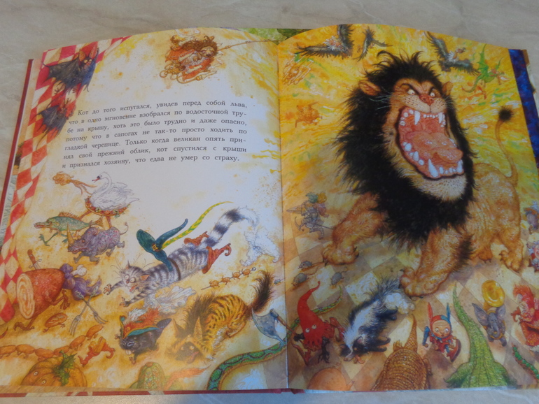 Выбор иллюстраций касается и еще одной книги - "Кот в сапогах". Есть у меня замечательный вариант с рисунками Кокорина, но сыну было скучно( А вот в рисунках того же Антона Ломаева и слушает, и разглядывает! Особенно нравится ему этот разворот: