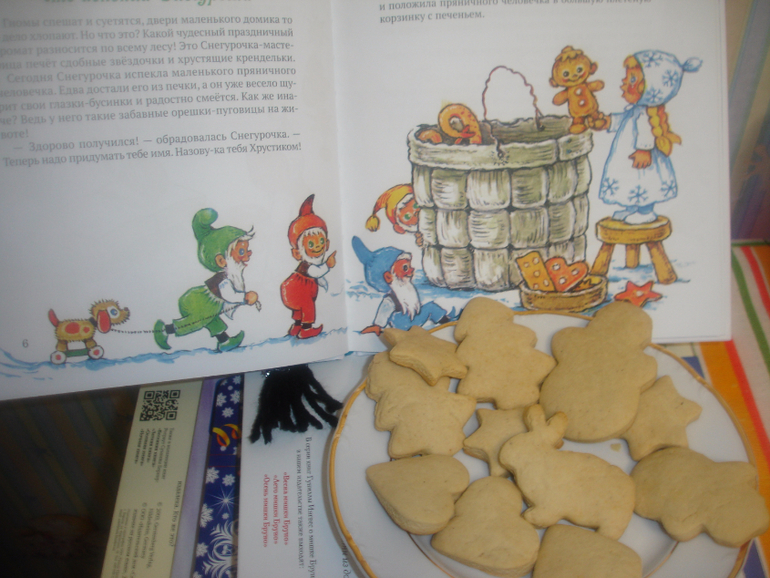 «Зимняя сказка» М.Старасте - самое длинное прочитанное произведение. По моим ощущения, не только новогоднее, а вообще. С первого же раза прочитали всю целиком, не отрываясь. Я ещё не умею разбивать произведения на главы, не знаю, сколько надо читать за один раз, как потом вспоминать прочитанное...и т.д.Так что я не стала заморачиваться. Саня высидел, слушал внимательно. Стиль повествования какой-то интересный: язык сам собой ворочается медленней, почему-то так и хочется никуда не спешить. Опять же для моего читателя книга подходит. Мне удобно, что книга разбита на главы, каждая из которых завершается примерно одинаково: пряник Хрустик уходит от кого-нибудь. «Рождество» я заменяла на «Новый год». Религиозной составляющей в сказке нет вообще, а сейчас объяснять разницу между праздниками я не собираюсь. Всё-таки из крупных историй «Зимнюю сказку» читали меньше, чем «Ёлка, кот и Новый год». Но ещё же январь впереди. Имбирные пряники пекли, как я и говорила. Еле собрала несколько штук, чтобы сфотографировать. Саня у всех зайцев отгрыз уши, у ёлок - верхушки и вообще столько съел, что я уже переживать стала, чтоб аллергии не было. Всё-таки там мёд, корица, имбирь. Хорошо обошлось.